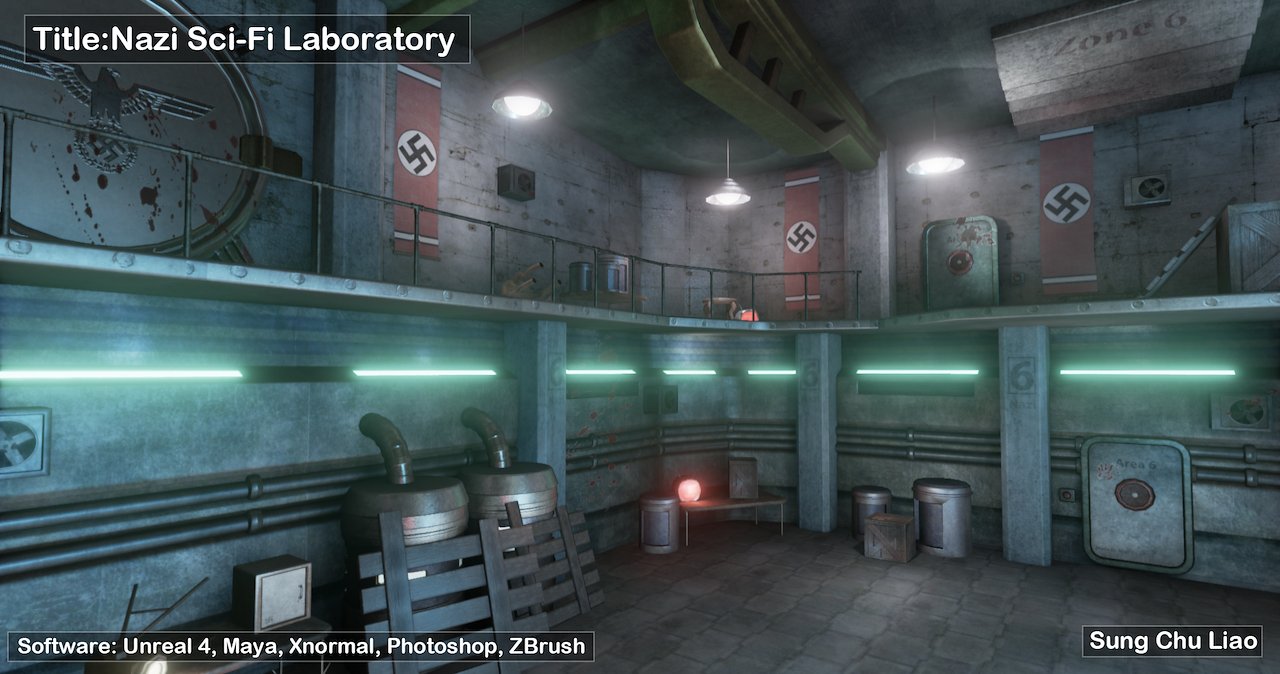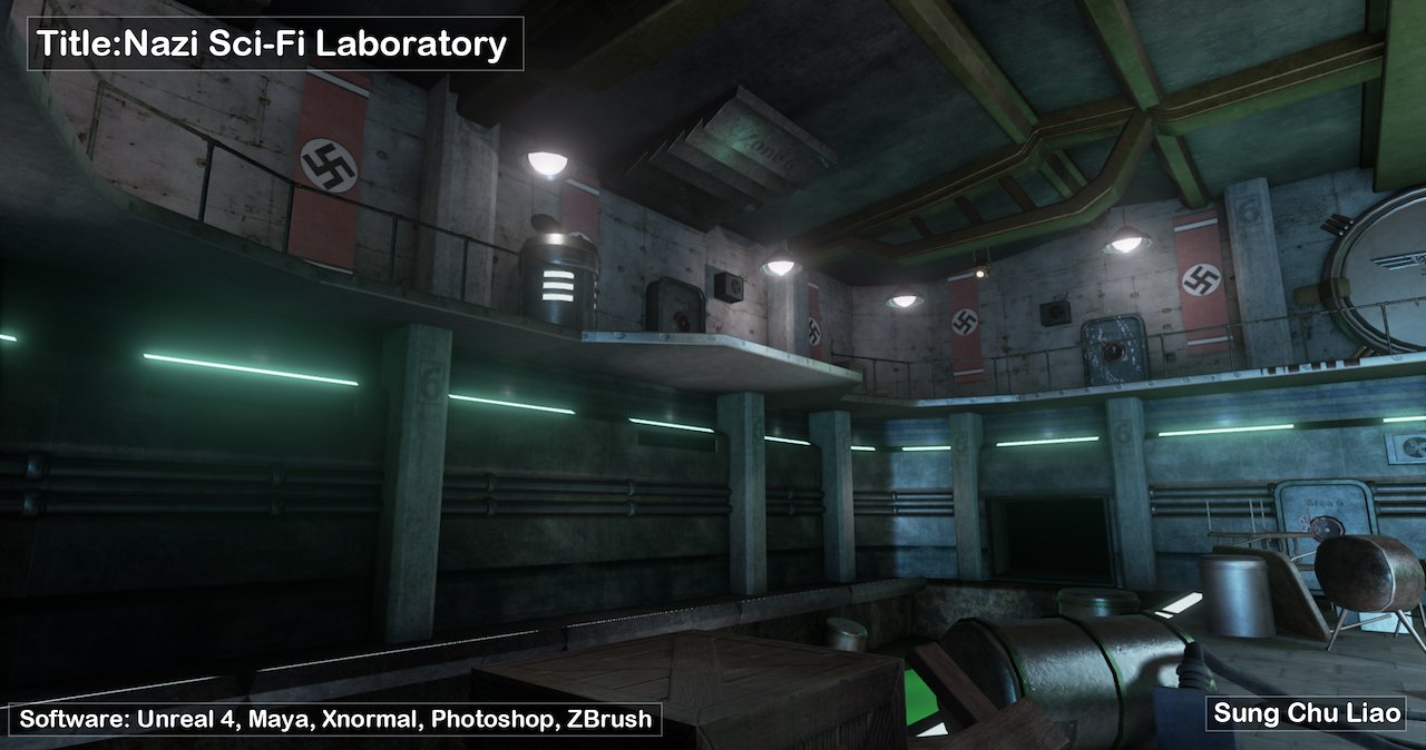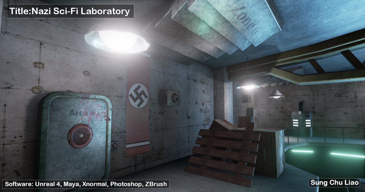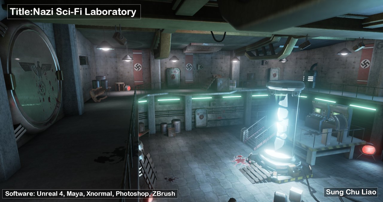 This project was my final project for my environment modeling class last year. The concept was base on the Nazi mix of Sci-Fi. Before I started the project, I use Photoshop to create the layout of the maps. I would then used Maya to model the element. After I finished the modeling and UVing, I bring the model to ZBrush to create the High Res model and bake a normal map with X-Normal. At last, I put all of this element to unreal 4 and play around the material blueprint.
